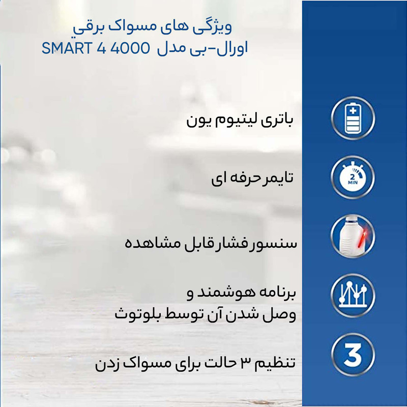 مسواک برقی اورال بی مدل اسمارت 4 از سری تولیدات هوشمند این شرکت که به فناوری بلوتوث مجهز شده و به اپلیکشین خود وصل میشود تا با هدایت شما تجربه ی بهتری از مسواک زدن را به شما بدهد. این مدل دارای دو سری از نوع Cross Action می باشد که به همراه یک عدد استند شارژ حرفه ای که دو عدد سری نیز روی آن قرار میگیرد عرضه میشود. این مدل دارای سنسور فشار و هشدار تمام شدن باتری می باشد که چراغ تعبیه شده روی آن نمایان می گردد. سه مدل مسواک روزانه، تمیزکنندگی قوی و سفید کننده این مدل با سر مسواک های جایگزین زیر سازگار است: Cross Action، 3D White، Sensi Ultrathin، Sensitive Clean، Precision Clean، Floss Action، Tri Zone، Dual Clean، Power Tip، Ortho Care همچنین این مسواک سری برق 2 شاخه انگلستان را دارد که به همراه تبدیل برق ارائه می گردد.این مسواک ساخت کشور آلمان به همراه 2 شاخه انگلیسی می باشد که به همراه تبدیل ارائه می گردد.