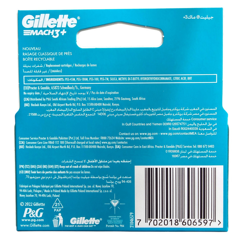 تیغ یدک +Gillette Mach3 با راحتی باورنکردنی و کمترین فشار بر روی پوست، حس یک اصلاح فوق حرفهای را برای شما به ارمغان میآورد. نوار آبی رنگ بالای تیغهها به عنوان یک روان کننده به لغزش ژیلت روی پوست کمک میکند و باعث جلوگیری از آسیب به پوست و کمک به اصلاح سریعتر و بهتر میشود. تیغ یدک +Gillette Mach3 مناسب براي تمام دسته هاي سري +Mach3 يا Mach3 Turbo و هر مدل با نام Mach3 است. سري یدک با تيغ هاي تيز تر و مقاوم تر طراحی شده که حس اصلاح بهتری نسبت به خودتراشهای یکبار مصرف حتی پس از 10 بار استفاده به شما بدهد. تیغ یدک +Gillette Mach3 دارای تیغههای ضد اصطحکاک و با فاصله نزدیک برای اصلاح بهتر طراحی شده است. قابل ست شدن با تمام سریهای مدل Mach3 است. دارای سری انعطاف پذیر و دارای نوار لغزنده ضد حساسیت که پوستی شاداب و صاف را به شما بدهد. تیغ یدک +Gillette Mach3 دارای سری 3 تیغه است.