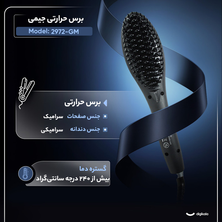 برس حرارتی جیمی مدل GM-2972 ابزاری کاربردی برای صاف کردن، فر کردن و حالتدهی سریع مو است. صفحات و دندانههای سرامیکی حرارت را یکنواخت منتقل میکنند و به موها درخشش و نرمی میدهند. دمای دستگاه بین ۱۵۴ تا ۴۰۰ درجه سانتیگراد قابل تنظیم است و در ۳۰ ثانیه آماده استفاده میشود، بنابراین برای انواع مو مناسب است. کابل ۱٫۷ متری آزادی حرکت کافی فراهم میکند و فناوری تولید یون از الکتریسیته ساکن مو جلوگیری میکند. نشانگر LED وضعیت دستگاه را نمایش میدهد و خاموشی خودکار پس از ۶۰ دقیقه ایمنی استفاده را تضمین میکند. این برس با کاربری ساده و طراحی مقاوم، گزینهای ایدهآل برای استفاده روزانه و دستیابی به موهایی صاف، سالم و براق است.