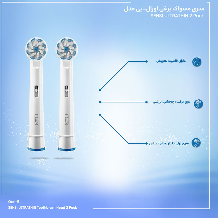 پک سری مسواک برند «اورال - بی» (Oral-B) حاوی دو عدد سری مسواک است که برای دندانهای حساس و معمولی طراحی و ساخته شدهاند یدک مسواک برقی اورال بی مدل SENSI ULTRATHIN با برس فوق العاده نازک، دندانه های بسیار لطیف و در عین حال کارامد، قدرت تمیز کنندگی و پاک کنندگی بالایی دارد و پلاک های میکروبی که عامل اصلی التهاب لثه است را ازبین می برد. این سری مجهز به تکنولوژی نوسانی و چرخشی برای حداکثر تمیز کردن می باشد. سری مسواک برقی اورال بی مدل SENSI ULTRATHIN قدرت پاک کنندگی بالایی دارد و با قرار دادن برس بر روی تک تک دندان ها، هر دندان به روشی درست و ملایم تمیز می شود. اگر قصد خرید سری مسواک بسیار با کیفیت و کاربردی را دارید پک سری مسواک برند «اورال - بی» (Oral-B) بهترین گزینه برای شما است.