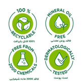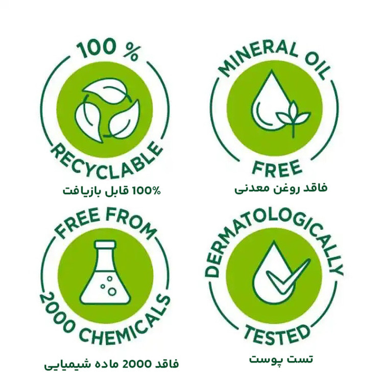 پوست را خشک نمیکند و بدون رنگ مصنوعی یا عطر اضافه و بدون صابون، بدون الکل، بدون پارابن، بدون فتالات میباشد.