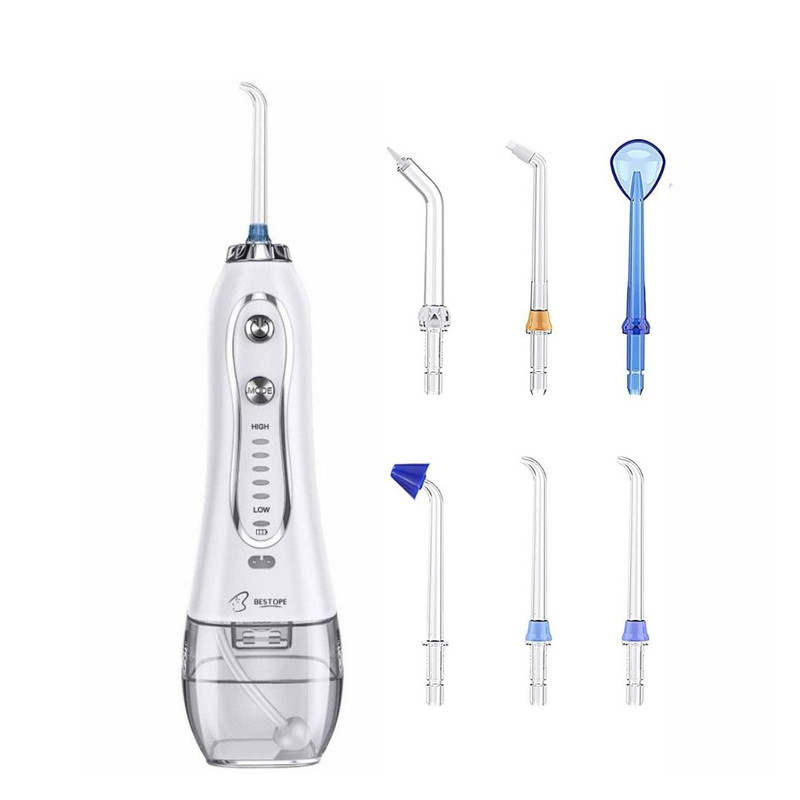 داشتن دندانهای سالم و سفید از مهمترین عوامل در زیبایی افراد است و میتوان با یکبار هزینه صحیح، این سلامتی و زیبایی را سال ها همراه داشت. واتر جت دندان خانگی دستگاهی است که با پاشیدن آب با فشار به دندانها و لثهها، جرمهای باقی مانده و باکتریهای مضری که در اعماق دندانها و لثهها مخفی شده اند و حتی با مسواک از بین نمیروند را از دهان خارج مینماید. دستگاه واتر جت دندان خانگی علاوه بر پاک کردن فواصل بین دندانها، میتواند به کاهش التهاب و خونریزی لثه، جرم گیری بهتر ، تمییز کردن بریجها و دندانهای ایمپلنت و روکش شده کمک نماید. با وجود اینکه ایمپلنتها ازمواد ضد پوسیدگی تولید میشوند اما واتر جت دندان میتواند با از بین بردن جرمهای باقی مانده در اطراف ایمپلنت از عفونت و التهاب لثه و در نتیجه سست شدن ایمپلنت جلوگیری کند که این امر در دوام و ماندگاری ایمپلنت ها تاثیر مشهودی دارد.این واترجت با داشتن سری ارتودنسی میتواند تمام جرم های اطراف سیم ارتودنسی را هم رفع کند. پس می توان نتیجه گرفت که با خرید این دستگاه در واقع چند دستگاه راه همزمان تهیه کردهاید. واتر جت دندان خانگی مدل HF-6 BESTOPE دارای ابعاد متناسب برای استفاده خانگی است که با داشتن سریهای متعدد امکانات فوق العاده ای فراهم نموده است.این مدل حتی دارای سری مخصوص جهت تمیز کردن زبان و بینی هم می باشد. این مدل دارای مخزنی به حجم 300 میلی لیتر است که این مقدار برای استفاده خانگی مطلوب است. این دستگاه یک ماساژور عالی برای لثه های شما نیز است. این مدل با امکان تنظیم فشار آب در 5 سطح قدرت برای پاک کردن پلاکتها و جرمهای اطراف دندان از بهترین دستگاه های واتر جت دندان خانگی بوده که افراد میتوانند هر روز استفاده نمایند.
