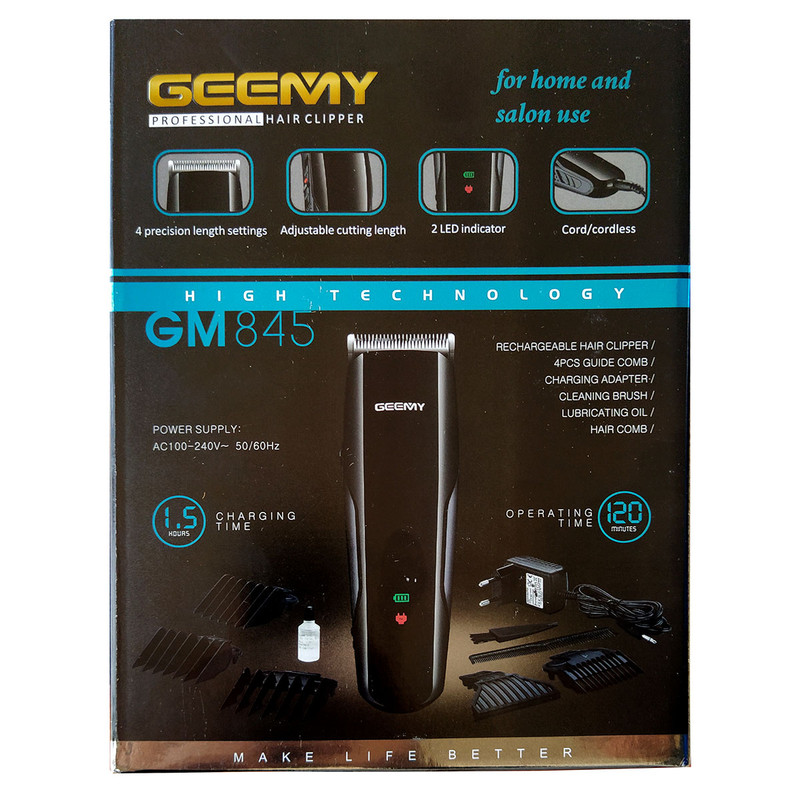 ماشین اصلاح حرفه ای جیمی مدل GM845 قابل استفاده بصورت برق مستقیم (باسیم) همچنین باتری قابل شارژ می باشد شارژ کامل آن 1.5 ساعت زمان نیاز دارد و قابل استفاده تا 120 دقیقه کارایی را دارد ولتاژ آن AC100-240V با فرکانس 50/60Hz می باشد باتری آن 700 میلی آمپر لیتیوم یونی است. همچنین دارای نمایشگر LED برای نشان دادن مقدار شارژ دستگاه می باشد. طراحی بسیار خوش دست و زیبا بصورت آرگونومیک بوده و همچنین شارژ آن و استفاده آن توسط آداپتور همراه می باشد