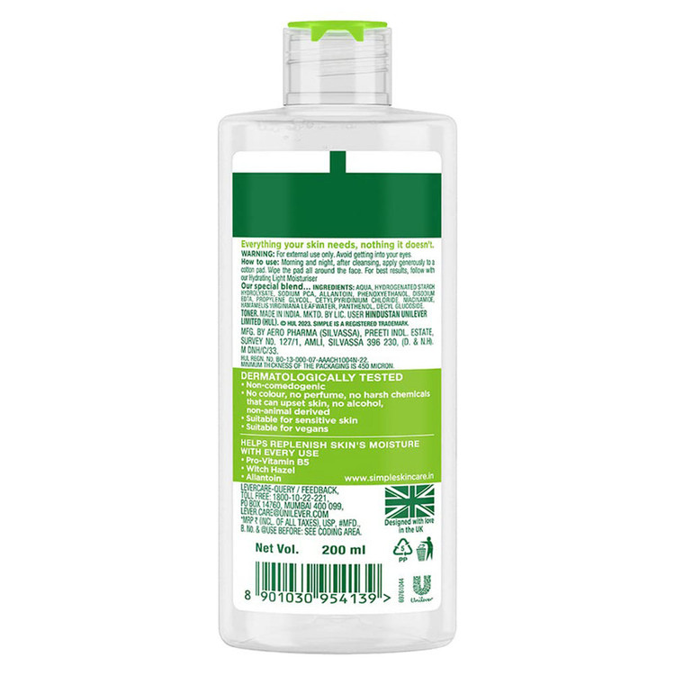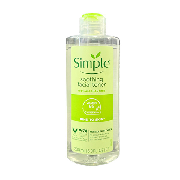 تونر سیمپل حاوی ویتامین B5 (نیاسینامید) و روغن فندق است. نیاسینامید پوست را بازسازی کرده و آن را شاداب و جوان می کند. همچنین این تونر پوست را نرم و لطیف می کند. این محصول همچنین، حاوی Allantoin است. Allantoin یک ترکیب طبیعی ست و در صنعت بهداشتی، برای درمان التهابات ناشی از حساسیت مانند خارش و خشکی پوست استفاده می شود. این محصول نیز مانند دیگر محصولات سیمپل، فاقد مواد شیمیایی مضر مانند رنگ، عطر، الکل و روغن های مینرال است و فرمولی تماما وگان دارد.
