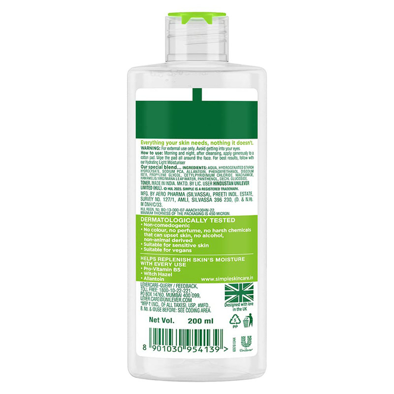 تونر سیمپل حاوی ویتامین B5 (نیاسینامید) و روغن فندق است. نیاسینامید پوست را بازسازی کرده و آن را شاداب و جوان می کند. همچنین این تونر پوست را نرم و لطیف می کند. این محصول همچنین، حاوی Allantoin است. Allantoin یک ترکیب طبیعی ست و در صنعت بهداشتی، برای درمان التهابات ناشی از حساسیت مانند خارش و خشکی پوست استفاده می شود. این محصول نیز مانند دیگر محصولات سیمپل، فاقد مواد شیمیایی مضر مانند رنگ، عطر، الکل و روغن های مینرال است و فرمولی تماما وگان دارد.