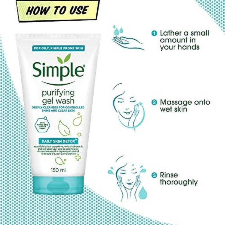 ژل شستشوی صورت سیمپل مدل Purifying Gel WashT یک شوینده ی روزانه مناسب پوست های چرب و دارای منافذ باز است. این ژل شستشو، حاوی آویشن، زینک و Witch Hazel است. این ژل، کاملا آلودگی ها و آرایش را به صورت کامل از پوست پاک می کند. این شوینده حاوی 5% عصاره ی برگ گیاه فندوق افسونگر است که اصلی ترین ماده برای جلوگیری از ایجاد لکه بر پوست در این شوینده است. این محصول مانند محصولات دیگر برند سیمپل، فاقد رنگ و عطر مصنوعی و مواد شیمیایی مضر است. سیمپل دوستدار حیوانات است و دارای فرمولاسیون وگان است. این محصول فاقد سالیسیلیک و الکل است.