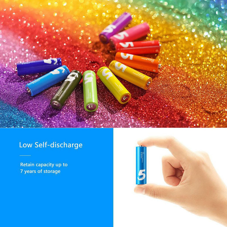 در باتریهای موجود در این پک از تکنولوژی باتری آلکالاین استفاده شده و باتریهای آن میتوانند تا سالها انرژی خود را حفظ کنند. این باتریهای 1.5 ولتی در بستهبندی 10 عددی عرضه میشوند و رنگبندی زیبا از جذابیتهای این پک به شمار میرود. این رنگبندی زیبا باعث میشود امکان نگهداری باتریها با هدف کلکسیونی وجود داشته باشد و حتی پس از مصرف هم بتوانید از زیبایی آنها برای دکور کردن اتاق استفاده کنید. باتریهای آلکالاین قابلیت شارژ ندارند؛ اما وجه تمایز آنها با سایر باتریها در ماندگاری و دوام آنهاست. باتریهای شیائومی میتوانند تا سالها در قفسهی فروشگاهها انرژی خود را حفظ کنند و آمادهی مصرف باشند؛ درنتیجه نگران خرید تعداد زیاد این باتریهای باکیفیت و نگهداری آنها در منزل برای روز مبادا نباشید. سلولهای این باتریها بدون افزایش حجم، ظرفیت بیشتری نسبت به باتریهای کربنی دارند و انرژی خروجی آنها روندی یکنواخت و پایدار دارد. اختلافپتانسیل آنها 1.5 ولت است که برای استفاده در اسباببازی، ماوس و کیبورد بیسیم، رادیوهای کوچک و سایر تجهیزاتی که از باتری قلمی تغذیه میکنند، مناسب است. این باتریها در یک محفظهی پلاستیکی مانند مداد شمعی در کنار هم قرار گرفتهاند و برای نگهداری باتریها هم میتوانید از همین جعبه استفاده کنید. باتریهای پک شیائومی به دلیل رنگارنگ بودن به باتریهای رنگینکمانی معروف شدهاند و میتوانند بهعنوان دکوری خوشرنگ و لعاب، قسمتی از میز کار شما را به خود اختصاص دهند.