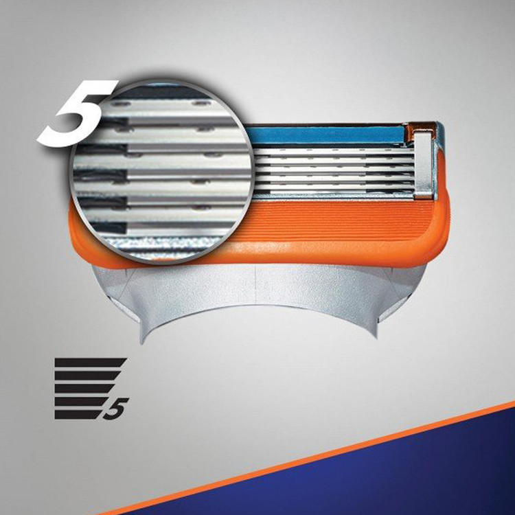 . جنس تیغهها از استیل ضدزنگ است و در برخورد با آب دچار زنگزدگی نمیشود. تیغهای یدک ژیلت برای استفادهی آقایان مناسباند. پنجعددیبودن تیغهها به اصلاحی راحت و سریع و با حداقل تماس با پوست کمک فراوانی میکند. وجود دو عدد نوار ژلی در بالا و پایین تیغهها موجب میشود هنگام خیسشدن، حالتی لیز و ژلهای پیدا کنند. این موضوع به لیزشدن سطح پوست و در نهایت حرکت سریع تیغهها روی پوست منجر میشود و در نهایت به اصلاحی روان، آسان و سریع کمک میکند. نوارهای ژلی از بریدهشدن پوست و ملتهبشدن پوست صورت جلوگیری خواهند کرد. همچنین تیغههای یدک دارای یک لبهی تیغ دقیق در پشت برای ایجاد خط هستند.