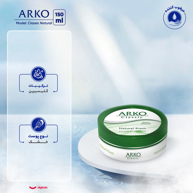 کرم مرطوبکننده آرکو ، مدل Classic Natural، مناسب پوستهای خشک، حاوی ویتامین E و گلیسیرین، ضد چین و چروک، جذب سریع، افزایش خاصیت ارتجاعی، مناسب استفاده در روز و برای صورت و بدن، حجم 150 میلیلیتر